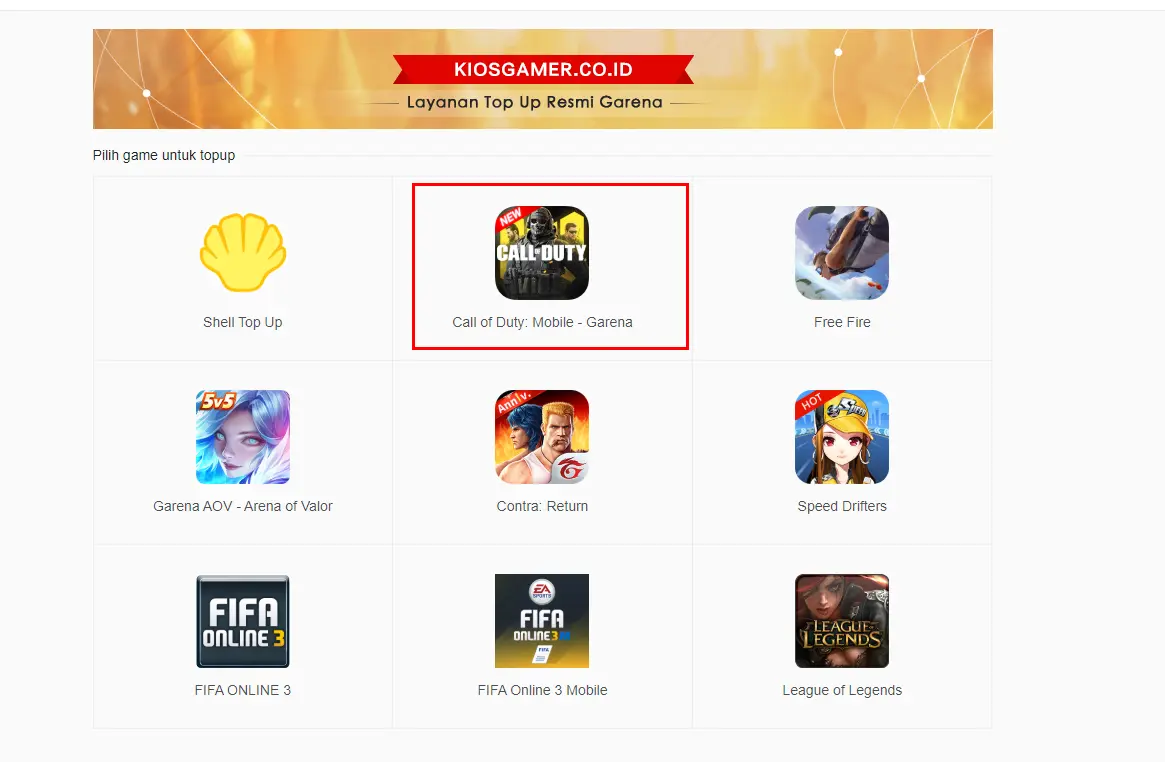 1. Kunjungi website kiosgamer.co.id, Pilih game yang ingin di top up. Contoh : Call of Duty Mobile - Garena.