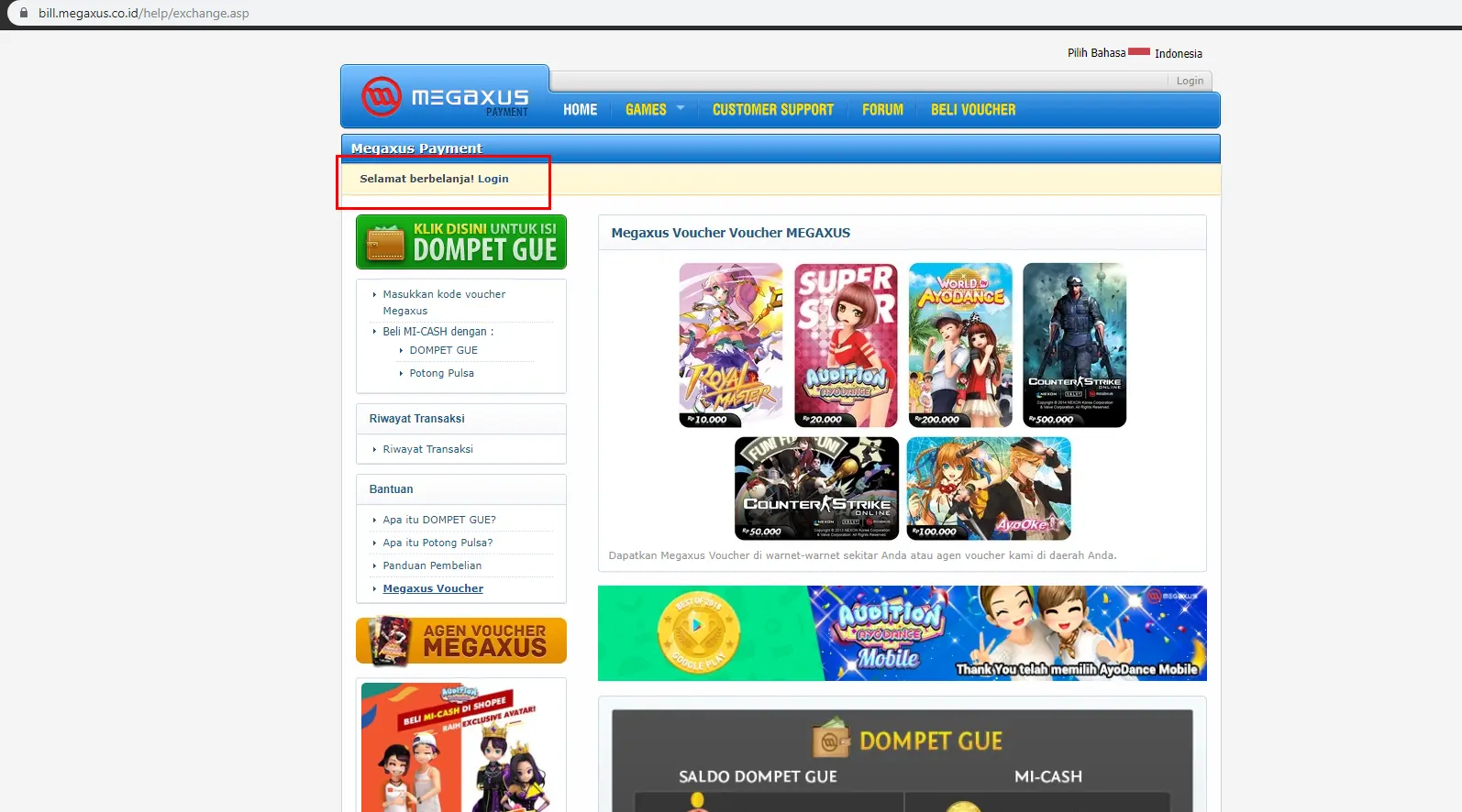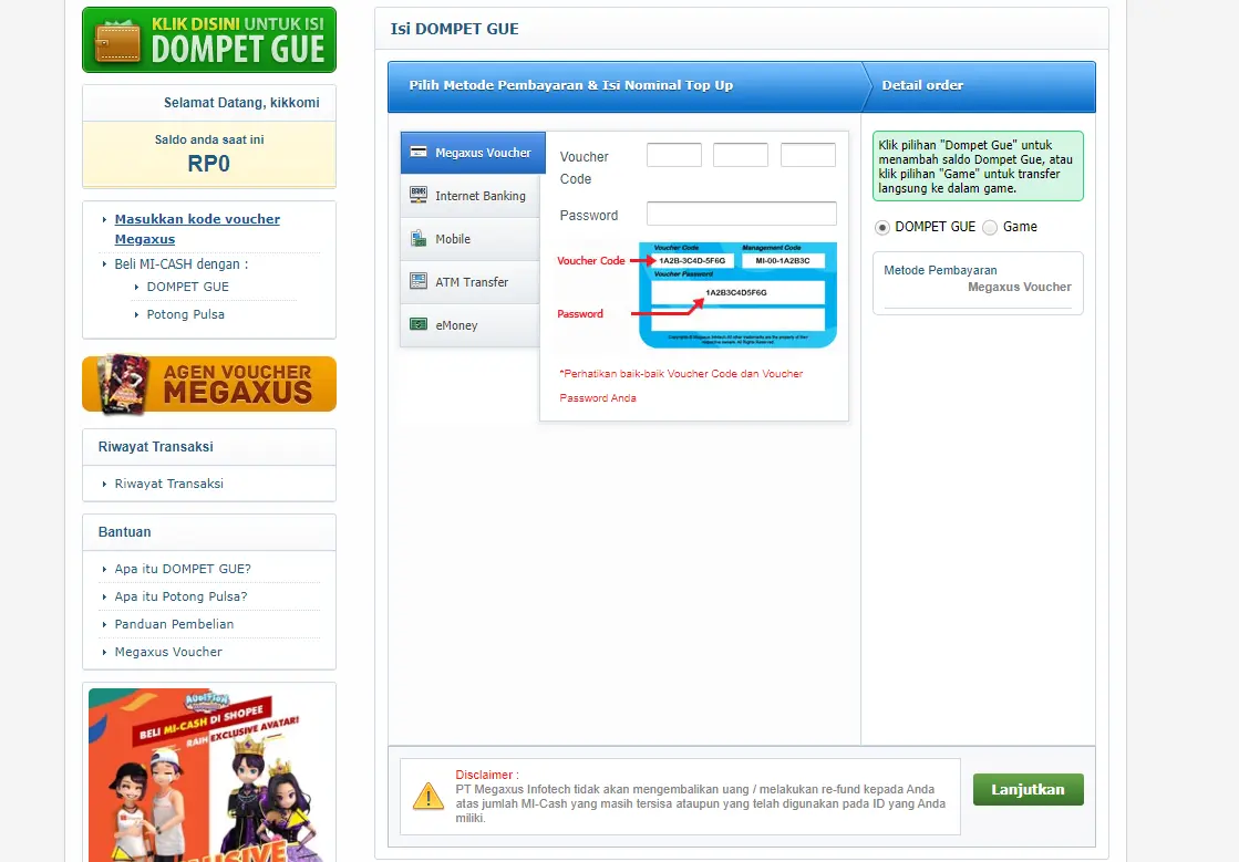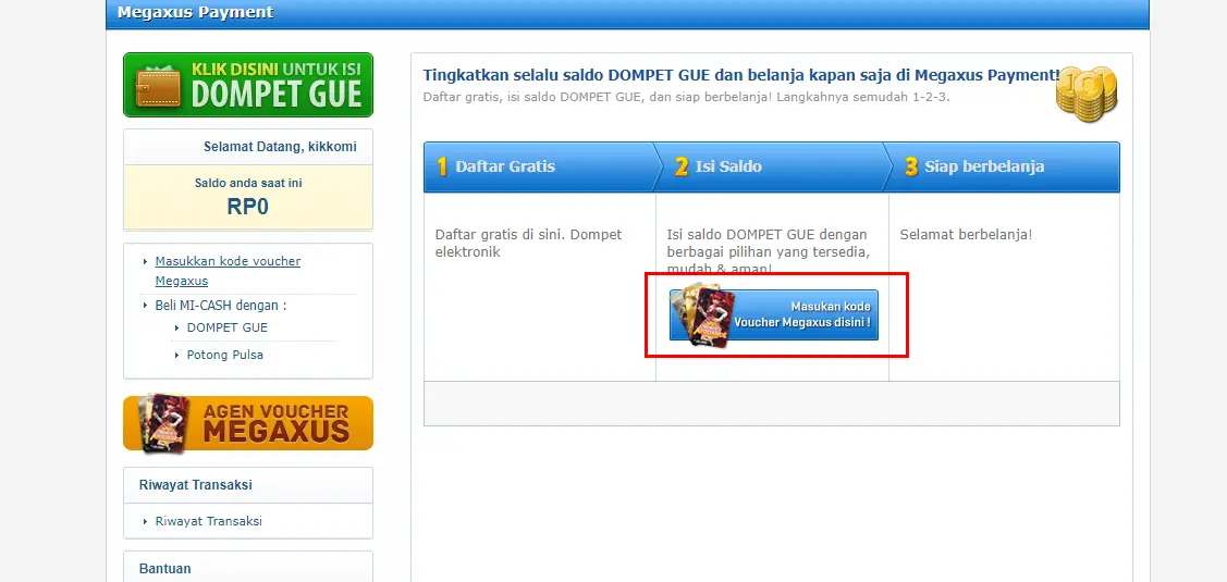 2. Klik Masukkan Kode Voucher Megaxus disini! Untuk langsung memasukkan kode voucher.