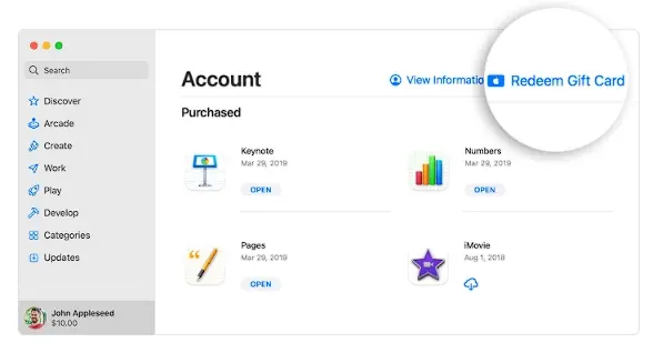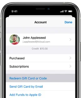 Jika anda menggunakan PC, redeem gift card anda di iTunes. Dari bar menu di bagian atas jendela iTunes, pilih Account, lalu pilih Redeem, lalu sign in dan ikuti petunjuk di layar.